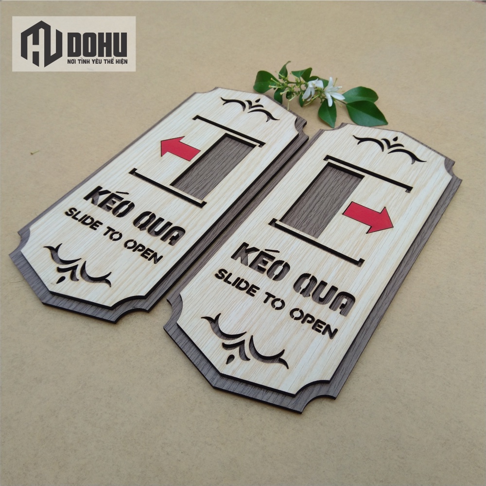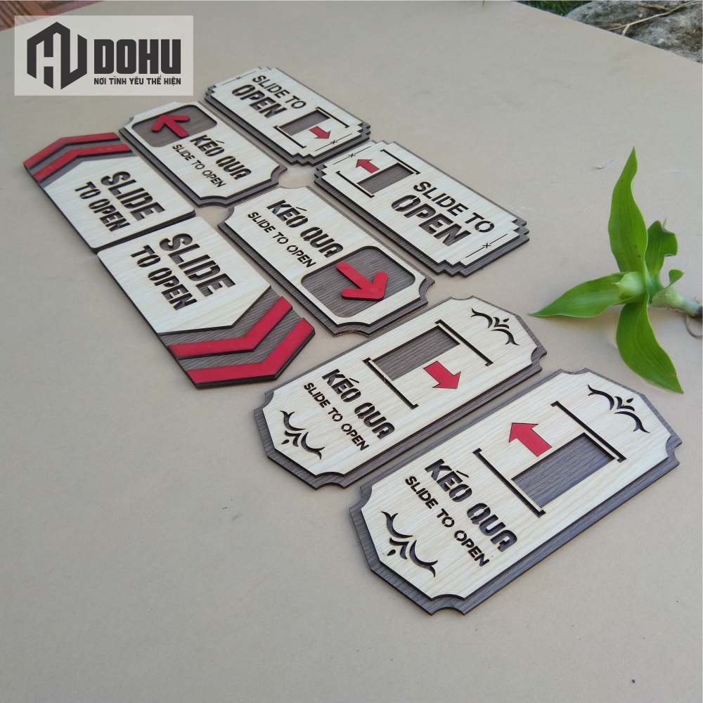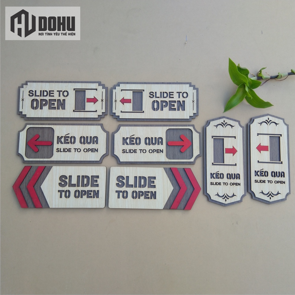Mến chào bạn!Cám ơn bạn đã đến với sản phẩm Bảng Chỉ Dẫn Kéo Qua Gắn Cửa (Slide to Open) Bằng Gỗ Vintage Decor Cắt Tia Laze (Có Sẵn Băng Keo 2 Mặt Phía Sau) của DOHU Shop!