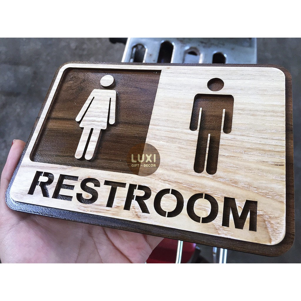 Bảng gỗ 1 mặt nội dung restroom với tông màu vàng nâu nổi bật, dễ nhận thấy.Có thể sử dụng băng dính xốp 2 mặt loại dày để dán ốp bảng vào tường - cửa nhà vệ sinh.