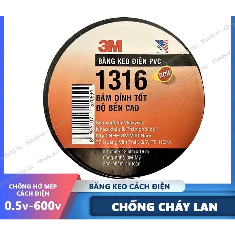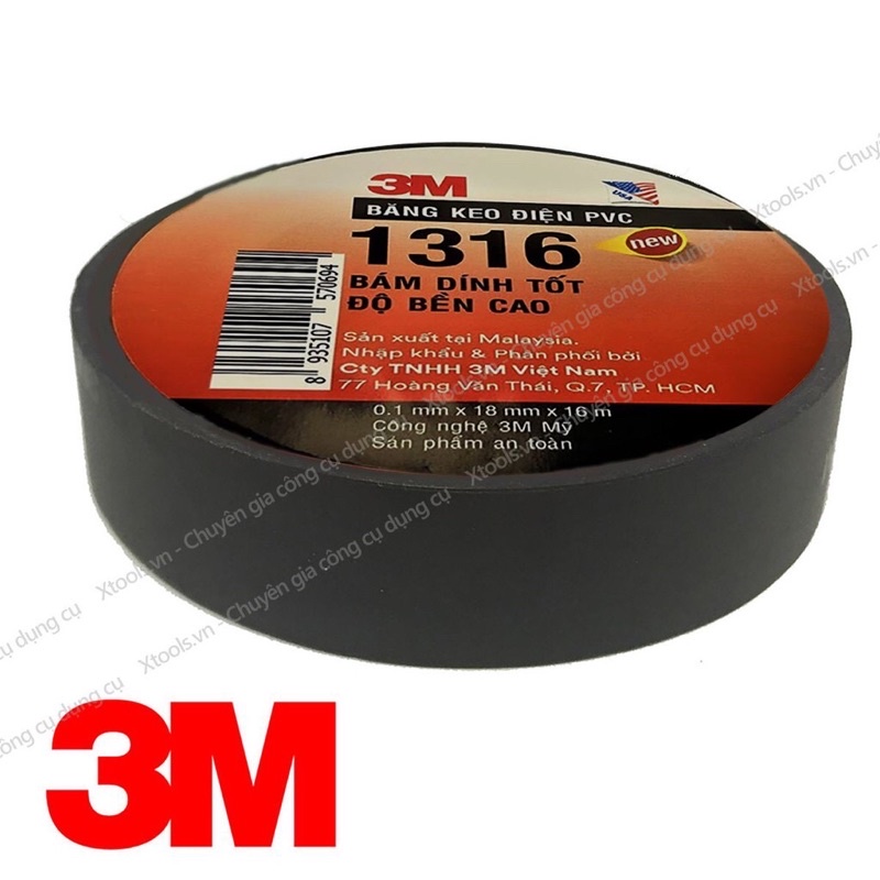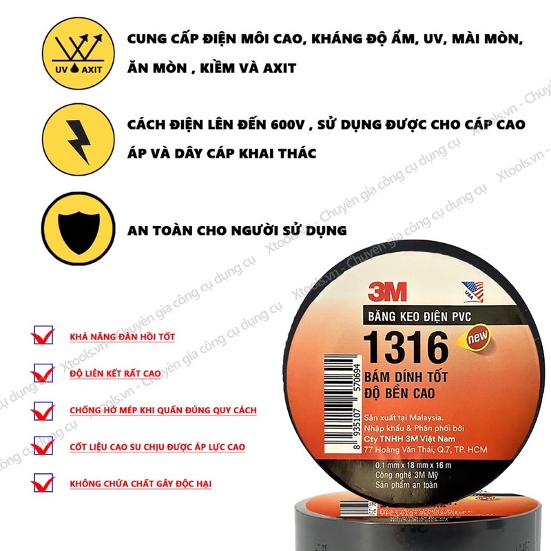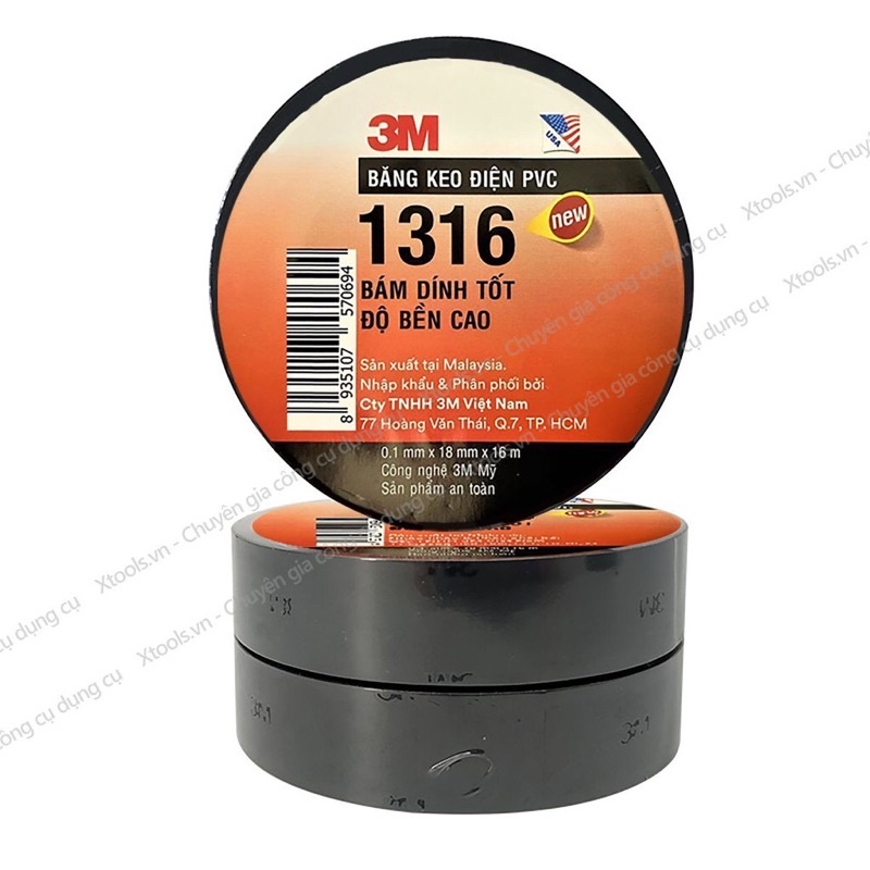 - Băng keo cách điện 3M 1316 bao gồm băng cách điện PVC có cung cấp điện môi cao cũng như kháng với độ ẩm, UV, mài mòn, ăn mòn, kiềm và axit.