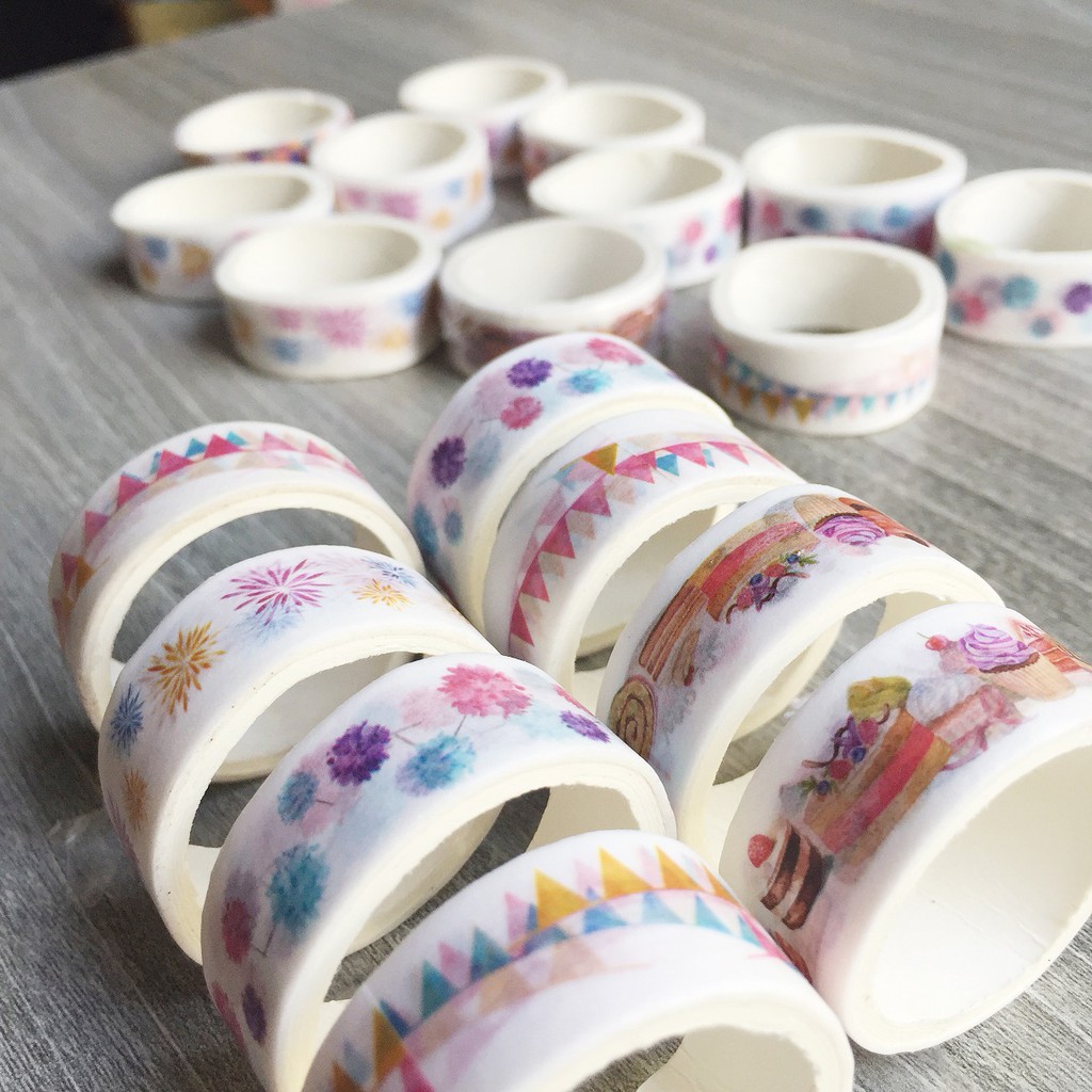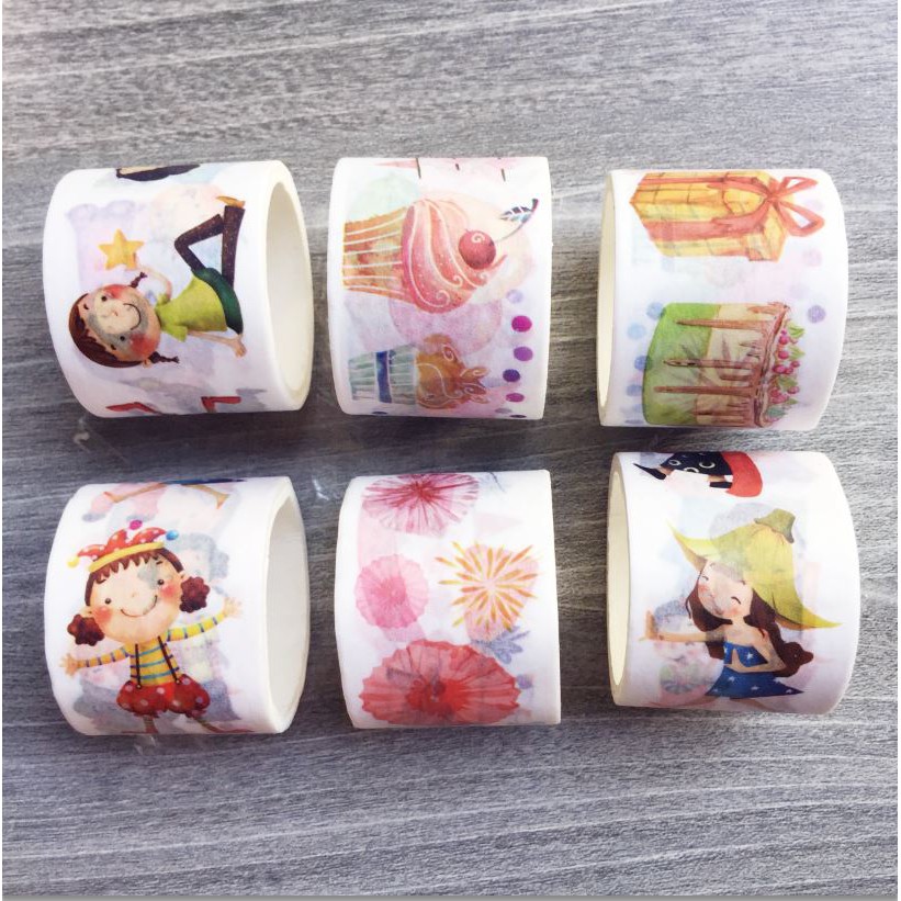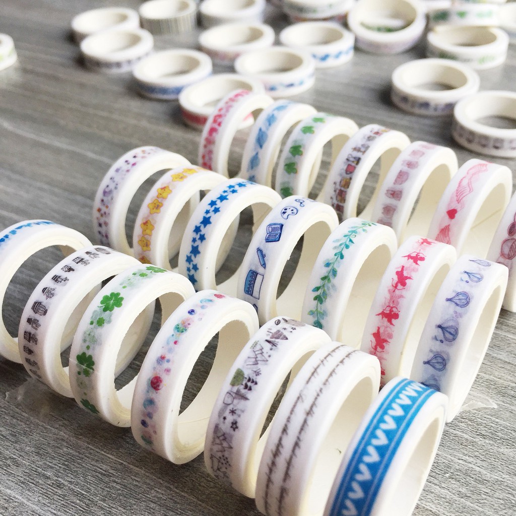 * Băng keo giấy trang trí nhiều họa tiết dễ thương, tiện dụng làm phụ kiện trang trí: chai lọ, dán tường, làm thiệp...cuộn với kích thước 8mm/15mm/30mm x3m nhỏ xinh