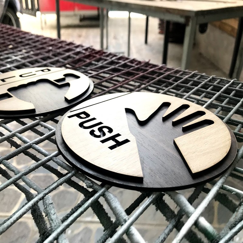 BẢNG CHỈ DẪN KÉO ĐẨY (PULL VS PUSH) GỖ 2 LỚP CẮT LASERDừng việc nhầm lẫn tại cửa! Sử dụng Nhãn Kéo cửa kính hai mặt này và đảm bảo mọi người mở đóng cửa chính xác.