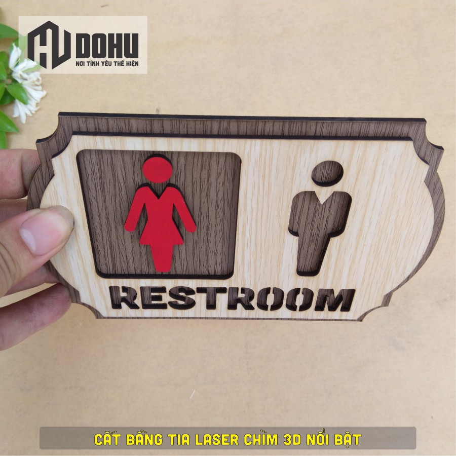 Bảng Restroom Treo Nhà Vệ Sinh, Nhà Tắm, Toilet, WC [DOHU322] Làm Bằng Gỗ Cắt Laser 3D Chìm Nổi (Có băng keo 2 mặt)