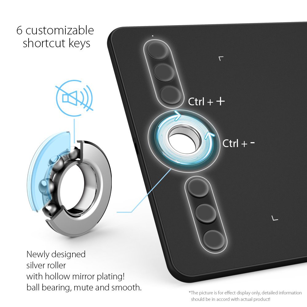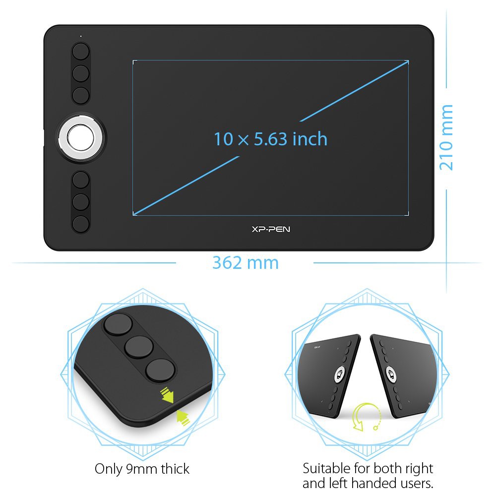 Vùng vẽ 10 x 5.63 inch cho không gian sử dụng rộng rãi để bạn vẽ và sáng tạo. 6 phím tròn có thể tùy chỉnh theo ý muốn vừa vặn với đầu ngón tay tạo nên chiếc bảng vẽ Deco 02 có hình thức tổng thể công thái học (ergonomy) tiện lợi.