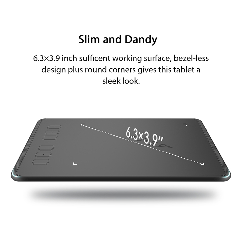Khu vực làm việc 6,3 × 3,9 inch là đủ và nhỏ gọn, và toàn bộ bề mặt trên cùng được bao phủ bởi cùng một chất liệu. Đừng bao giờ lo lắng về việc sạc bút, đầu tiên các sản phẩm của H640P có bút cảm ứng không dùng pin.
