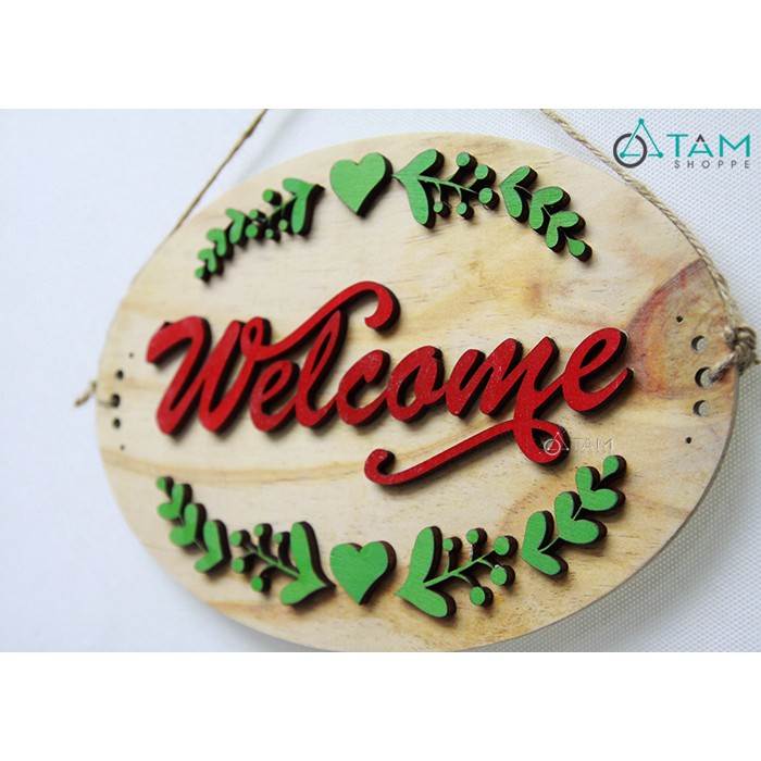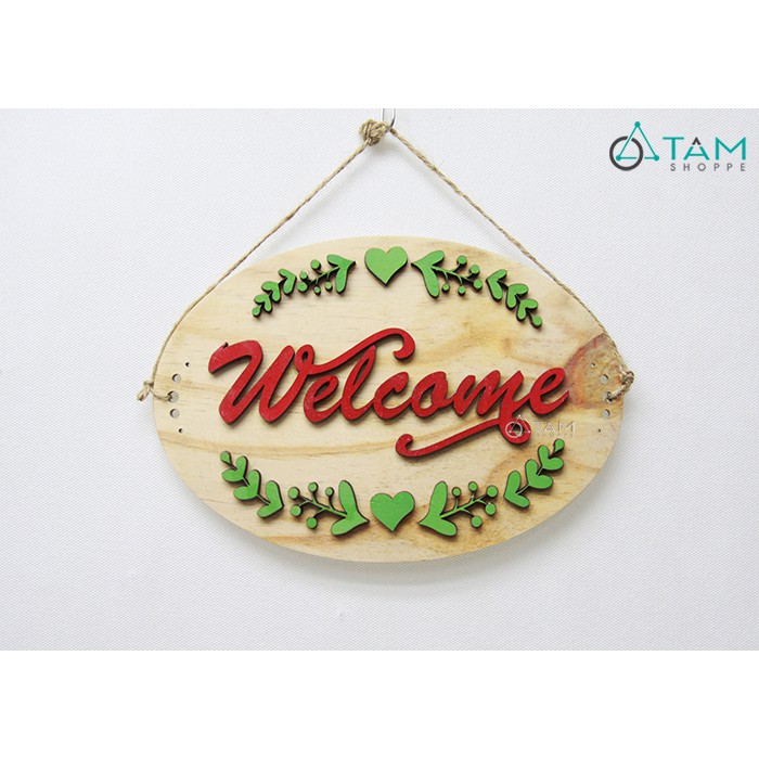 Bảng welcome gỗ hình Ovan cắt chữ và họa tiết dán nổi đẹp mắt. Bảng có 2 mặt nội dung giống nhau. Thích hợp treo hướng cắt ngang so với mặt đường đối diện cửa hàng, phòng có hành lang...>>> CHI TIẾT SẢN PHẨM: