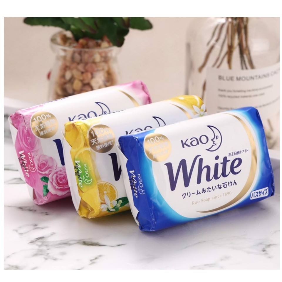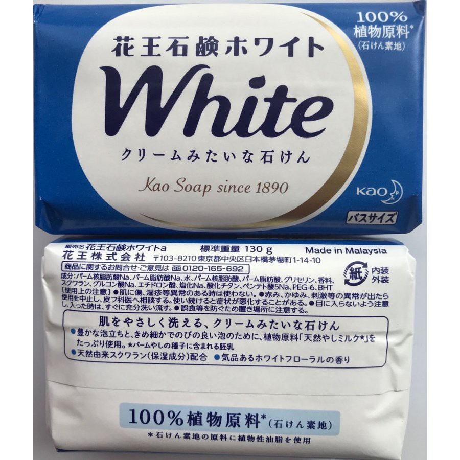 BÁNH XÀ PHÒNG TẮM TRẮNG KAO 130G - NHẬT BẢN"- Thành phần: Cọ axit béo kernel Na, Palm axit béo Na, nước, axit béo hạt cọ, acid cọ béo, glycerin