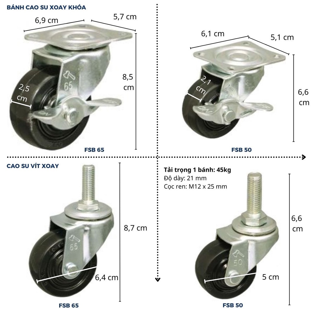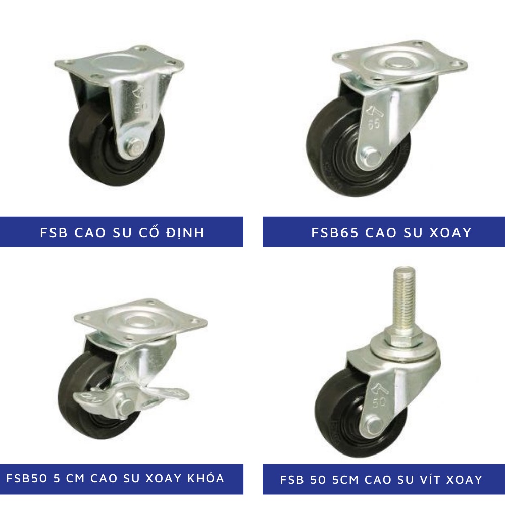 Gồm các loại: Bánh cao su cố định, cao su xoay, cao su xoay có khóa, cao su vít khóa.