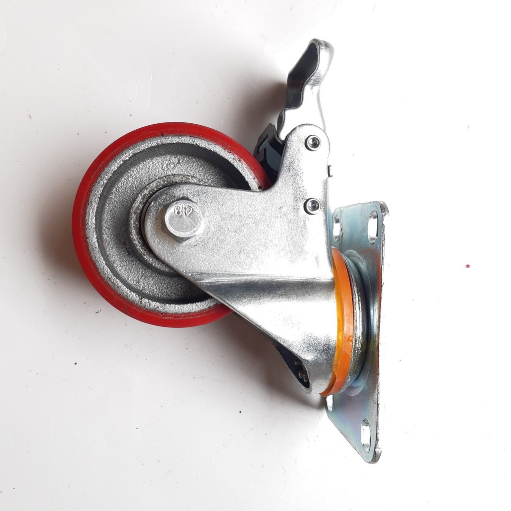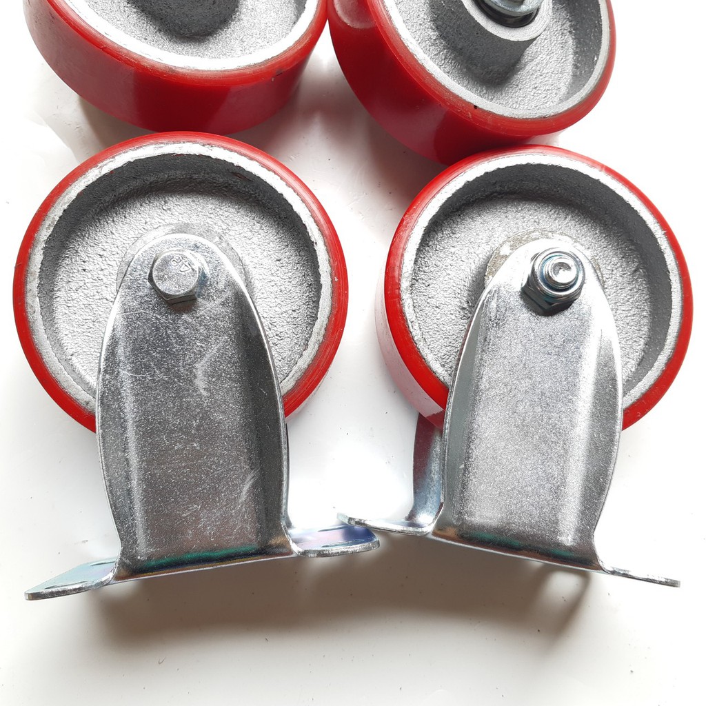 Bánh xe PU đỏ cốt gang tải nặng có vú mỡ trên cả đế càng thép và ổ xoay bánh xe giúp bảo dưỡng thuận tiện nhanh chóng. Lốp PU lăn êm, giảm ồn và có khả năng chống một số loại hóa chất nhẹ