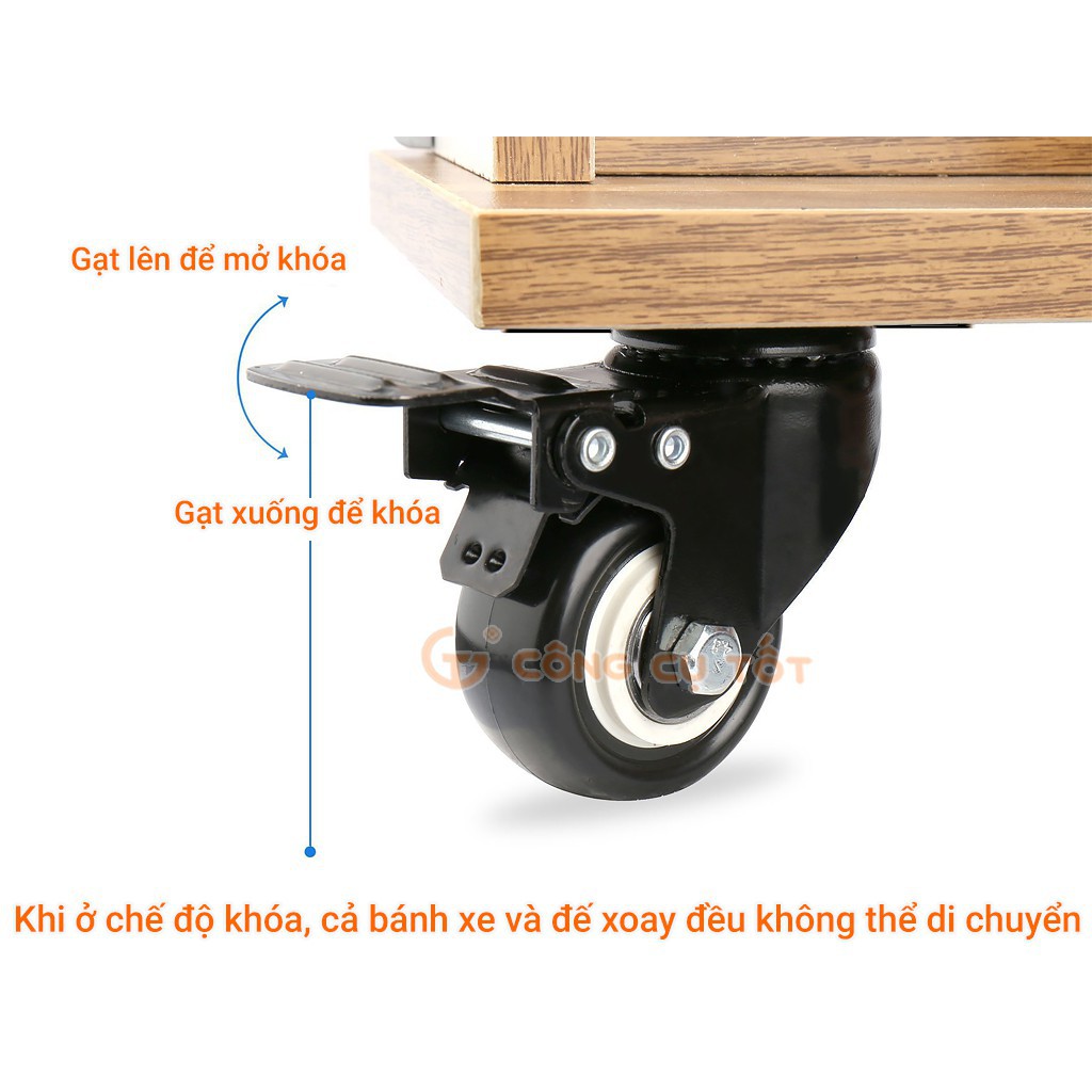Có 2 loại: có khóa hoặc không có khóa, Loại có khóa cố định bánh xe dừng xoay khi không cần thiết, tránh trôi trượt hàng hóa, đồ vật