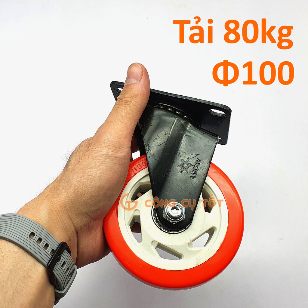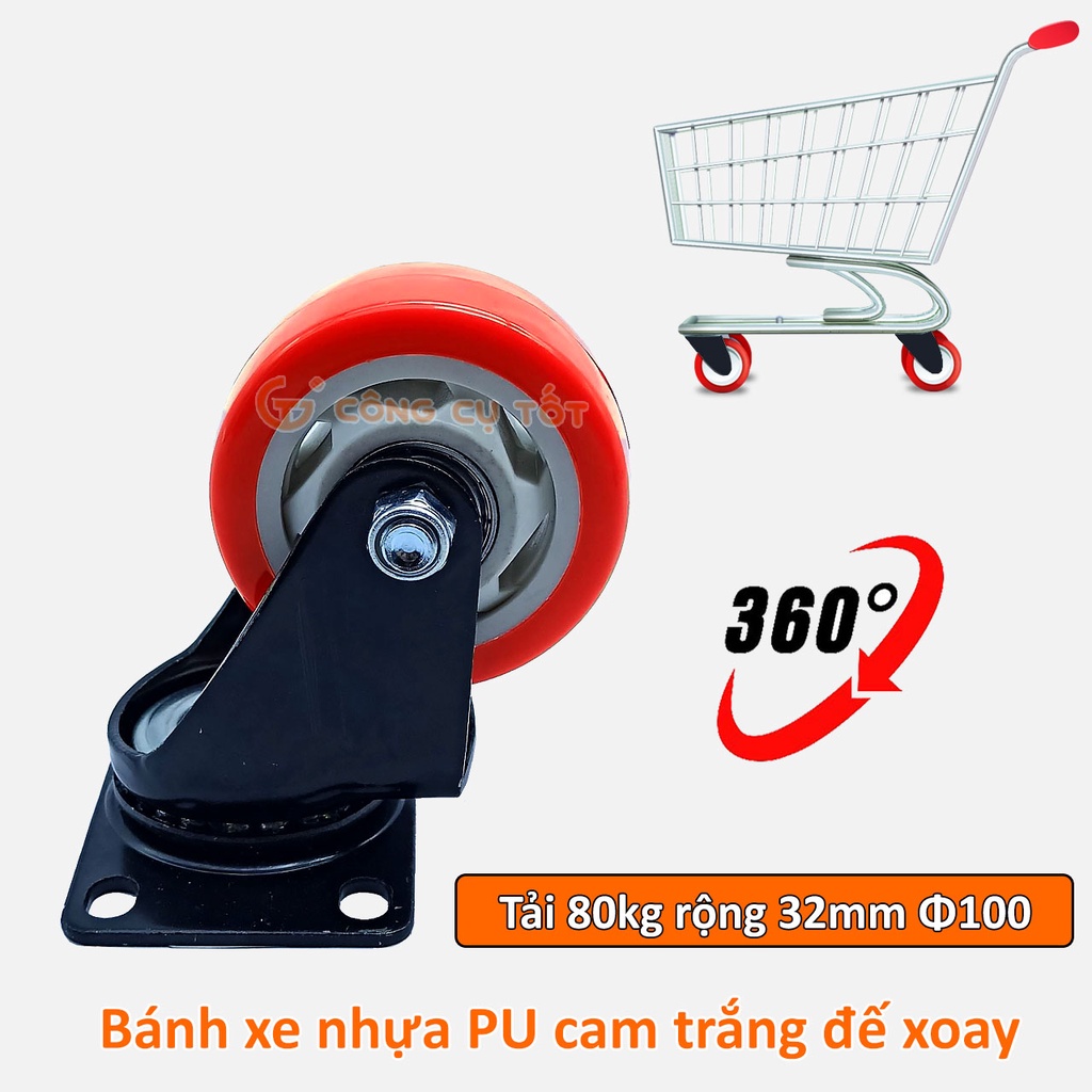 Bánh xe đẩy mặt đế xoay càng sắt tải trọng 80kg lốp nhựa PU cam trắng rộng 32mm Φ100mm là vật dụng hỗ trợ tối ưu hóa việc vận chuyển hàng hoá khi sử dụng xe nâng, xe đẩy hàng. Ngoài ra, sản phẩm cũng tương thích với nhiều loại: bàn, tủ, giường, đồ nội thất,… giúp cho công việc di chuyển đồ đạc trở nên nhanh chóng và tiện lợi hơn.Các đặc điểm, thông số kỹ thuật của sản phẩm