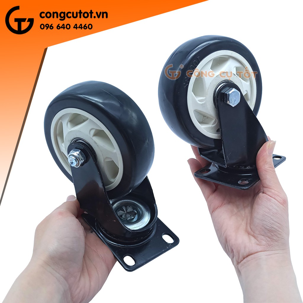 Nhà cửa & Đời sống > Dụng cụ & Thiết bị tiện ích > Xe đẩy || Bánh xe đẩy mặt đế xoay càng sắt tải trọng 80kg lốp nhựa PU đen rộng 32mm Φ100mmCòn hàng
