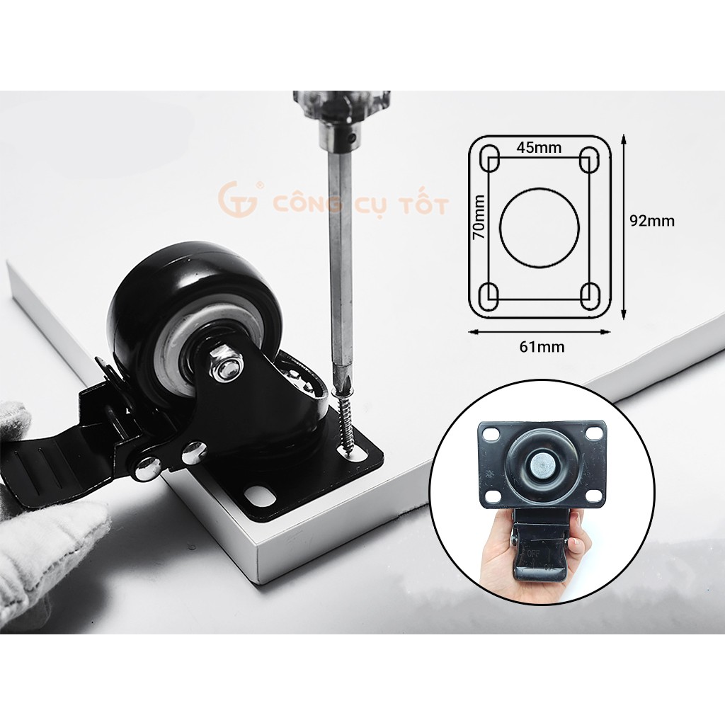 Mặt đế - Phẳng, có khả năng xoay 360° nhờ cơ cấu bi vòng bên trong. Ổ bi trơn tru và đai ốc chắc chắn. 4 lỗ rỗng xung quang mặt đế tạo thành hình chữ nhật có tác dụng ốp mặt đế lên mặt phẳng cần gắn bánh xe rồi bắn vít lên.