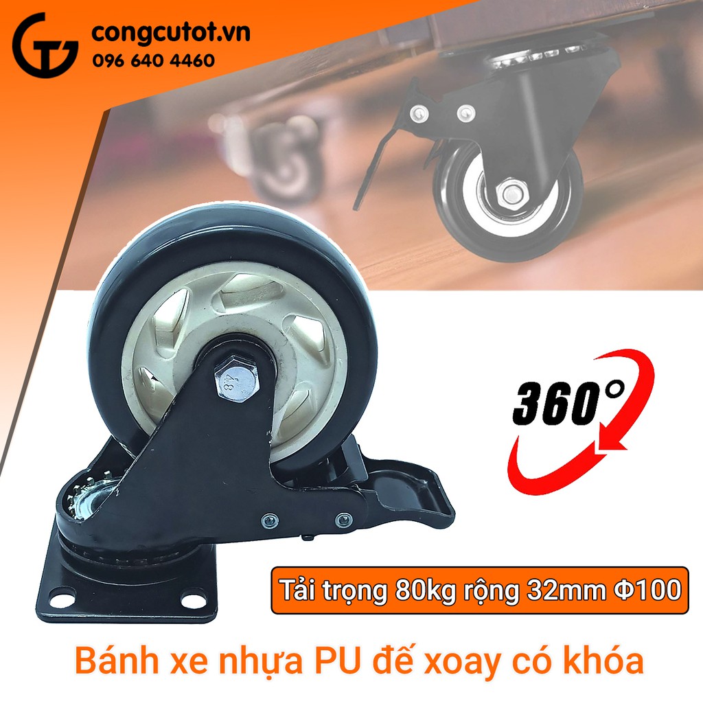 Giới thiệu Bánh xe đẩy mặt đế xoay càng sắt tải trọng 80kg lốp nhựa PU đen rộng 32mm Φ100mm