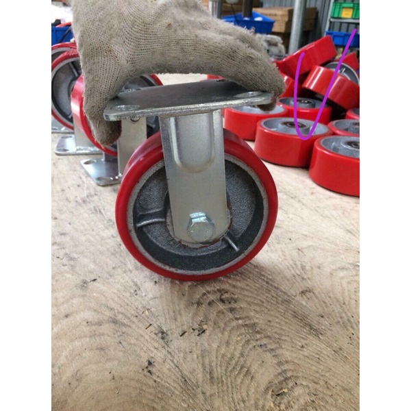 Bánh xe đẩy pu gang được sản xuất từ gang đúc đặc bọc lớp PU ( Polyurethane ) là chất liệu cực bền vượt trội về độ đàn hồi, có tính kháng mài mòn, và kháng tác động từ môi trường ( thời tiết, oxy hóa, ozone ) vượt trôi hơn cao su thông thường, hơn nữa có khả năng khả nhiều loại hóa chất vô cơ và hữu cơ khác. Đặc biết về khả năng chịu lực của PU cực cao.Bánh xe đẩy pu gang có nhiều loại kích thước đường kính từ 75mm tới 350mm chịu tải từ 100 kg tới 8,000 kg/ bánh được sử dụng phổ biếng trong các khu công nghiệp, nhà máy, ngành dệt may, kho bãi v..v…