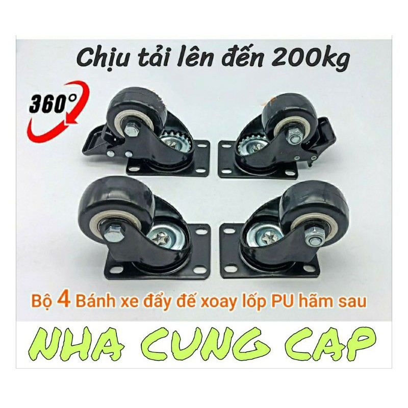 Bánh xe đen viền trắng gồm 2 bánh có phanh hãm và 2 bánh không có phanh hãmĐây là loại bánh cực tốt, chịu được tải trọng cao, chạy êm, nhiều bi