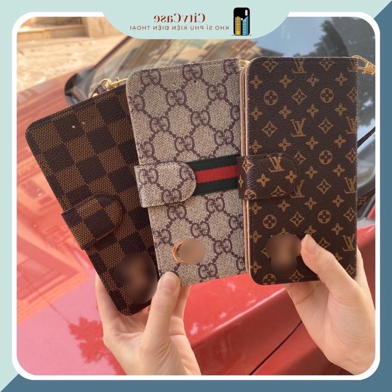 - Bao da nắp gập đồng màu 2 mảnh, thiết kế logo LV, Gucci.