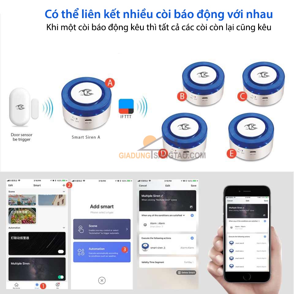 - Vì nằm trong hệ sinh thái nhà thông minh Tuya nên bạn hoàn toàn có thể phối hợp tạo ngữ với các thiết bị Tuya khác, ví dụ khi có đột nhập trái phép ngoài việc phát ra báo động và gửi thông báo tới điện thoại cho bạn thì đèn trong nhà sẽ sáng, còi báo động đặt ở các phòng sẽ hú inh ỏi...