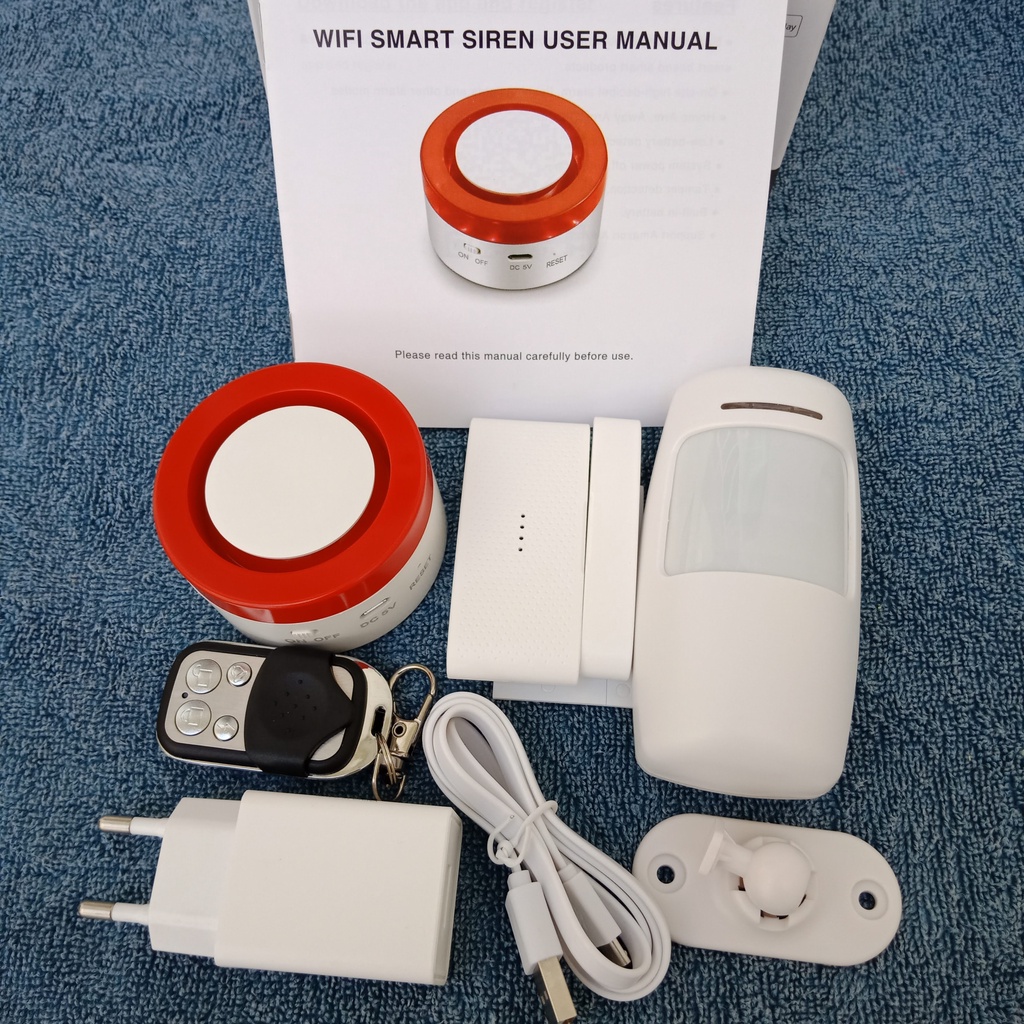 Bộ báo động, báo trộm không dây wifi Tuya- Bộ báo động bao gồm: 1 Còi hú báo động trung tâm, 1 cảm biến hồng ngoại phát hiện chuyển động, 1 má từ phát hiện cửa mở, 1 tay điều khiển từ xa, 1 nguồn 5V, 1 sách hướng dẫn.