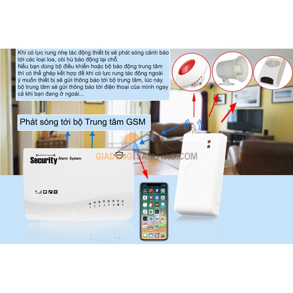 Ngoài ra nếu bạn có sử dụng bộ điều khiển trung tâm khi ghép nối với bộ cảm biến rung nếu có đột nhập trái phép bộ cảm biến sẽ gửi tín hiệu tới bộ điều khiển trung tâm, sau đó bộ trung tâm sẽ gửi cảnh báo tới điện thoại của bạn, vì vậy ngay cả khi bạn không có ở nhà vẫn có thể phát hiện ra các sự đột nhập trái phép.