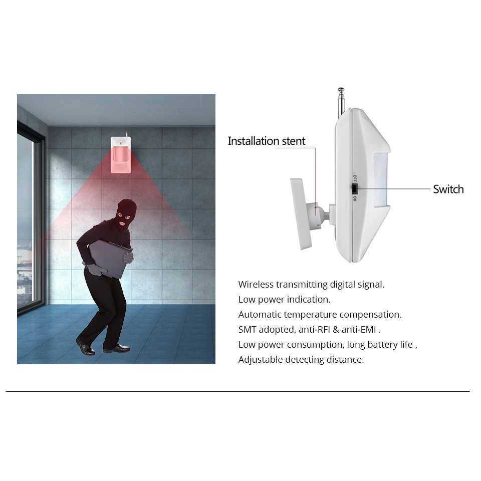 • Cảm biến hồng ngoại PIR không dây: Với góc quét rộng đến 120 độ, góc quét dọc đến 60 độ, phát hiện chuyển động chính xác trong phạm vi 6m, kết nối không dây với còi báo động trung tâm đạt khoảng 5-6m. Khi có người di chuyển trong không gian quét của cảm biến, tín hiệu sẽ được truyền không dây về còi báo động trung tâm và ngay lập tức sẽ phát âm báo động.