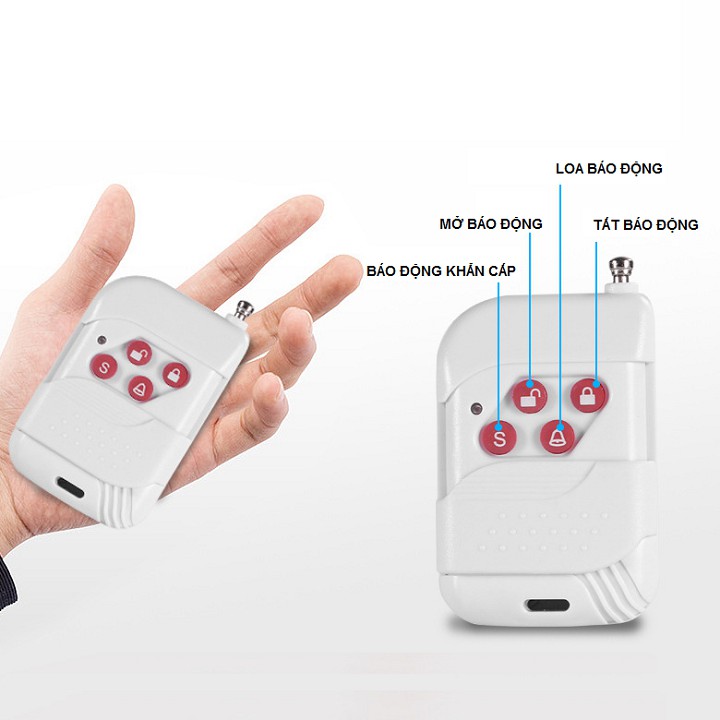• Remote điều khiển gồm 4 chức năng: khóa, mở khóa, chế độ cảnh báo, chế độ báo chuông cửa giúp bạn tùy chọn sử dụng bộ kit báo động theo nhu cầu một cách đơn giãn từ xa.