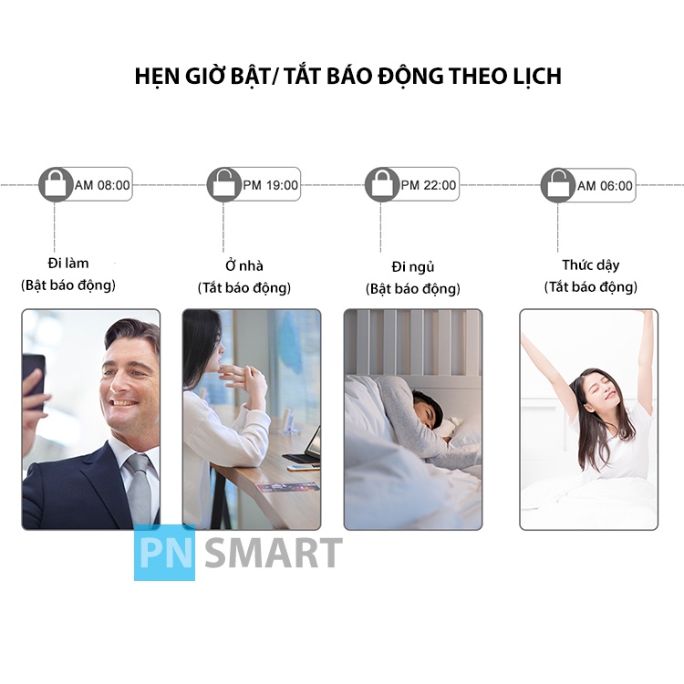 - Hẹn giờ bật/tắt báo động linh hoạt.