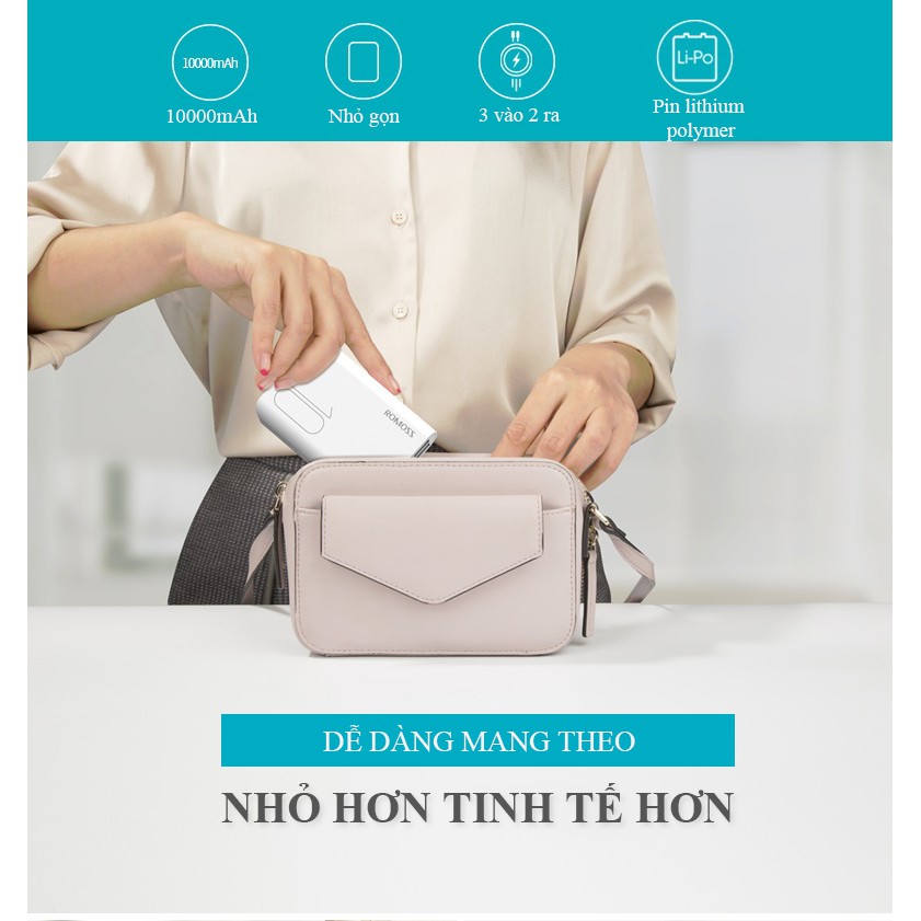 [BẢO HÀNH 1 ĐỔI 1 ]Pin sạc dự phòng 10000mAh Romoss sense 4 mini nhỏ gọn cực mỏng dễ dàng bỏ túi 2 cổng USB 3 cổng sạc