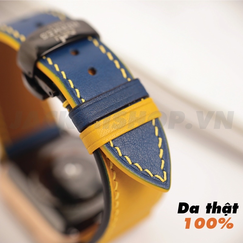 Giới thiệu [BẢO HÀNH 1 NĂM] Dây Da BÊ SWIFT may tay thủ công màu Vàng/Xanh Navy khóa Bướm cho Apple Watch series 1/2/3/4/5/6/7