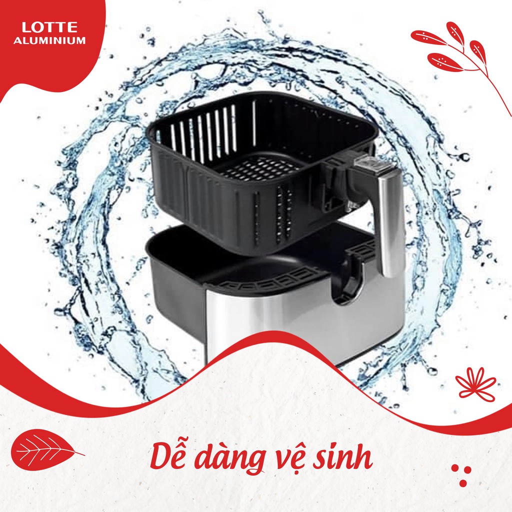 - Nồi chiên không dầu Lotte là sản phẩm có ngăn kéo phủ lớp chống dính có thể tháo rời và giỏ thức ăn có thể rửa được bằng máy rửa chén, giúp việc vệ sinh máy trở nên dễ dàng.