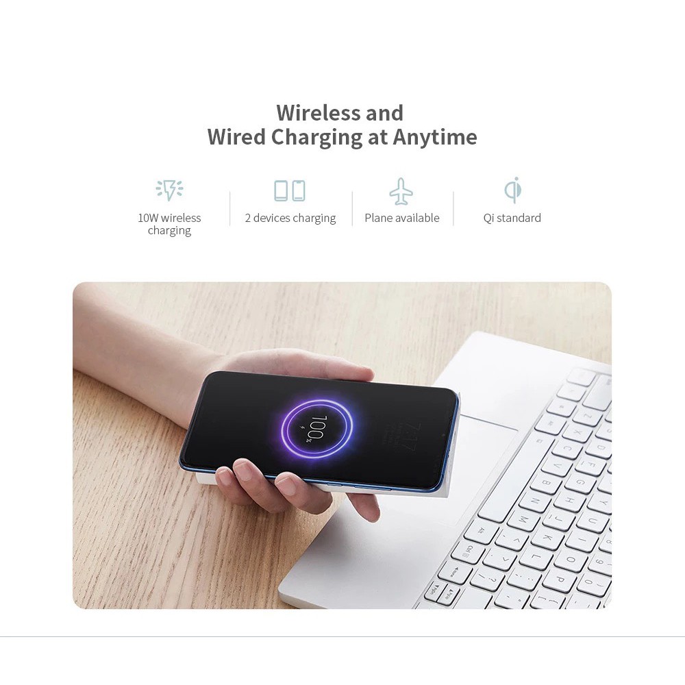 - Được tích hợp công nghệ sạc không dây chuẩn Qi với công suất lên đến 10W MAX, tương thích các thiết bị smartphone đạt chuẩn sạc Qi từ các nhà sản xuất như Apple, Samsung, Huawei,... Phạm vi cảm biến ≤5mm có khả năng nhận diện thiết bị nhanh chóng hơn, giúp đơn giản hóa thao tác sạc thiết bị, người dùng chỉ cần đặt thiết bị lên mặt trên của pin sạc dự phòng để sạc điện...