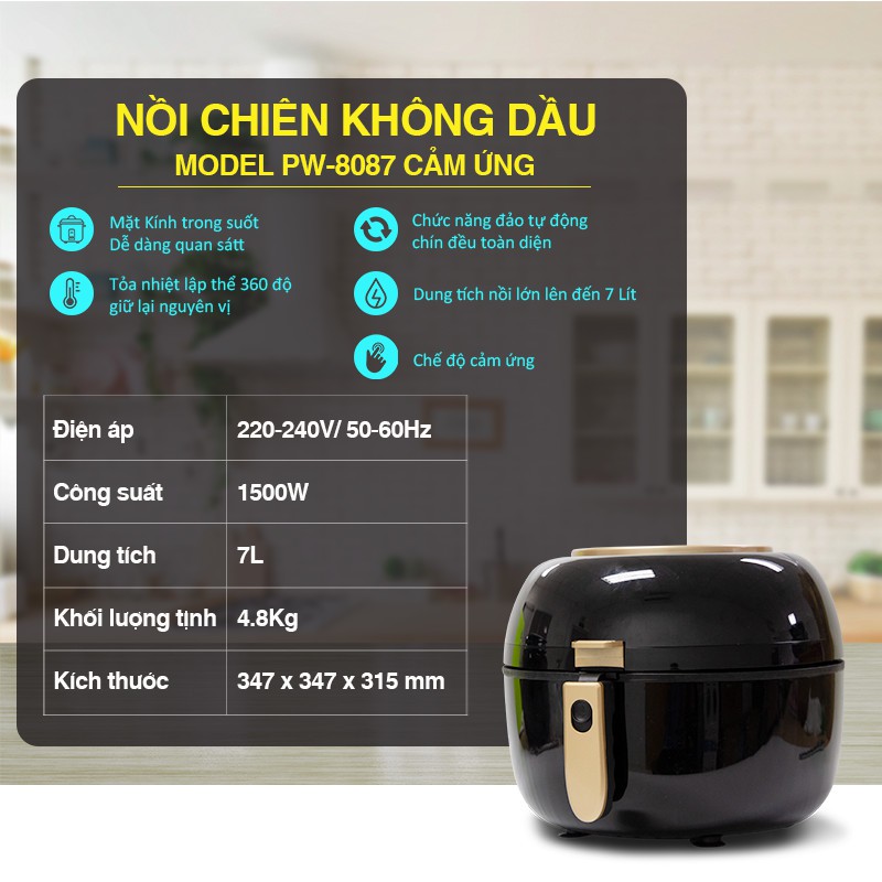Nồi chiên không dầu dung tích 7L, nồi chiên ko dầu công nghệ hàn quốc, công suất 1500W, thiết kế hiện đại, màn hình cảm ứng chạm, an toàn vệ sinh, bảo hành 12 tháng VS8087D• Model: PW-8087D.
