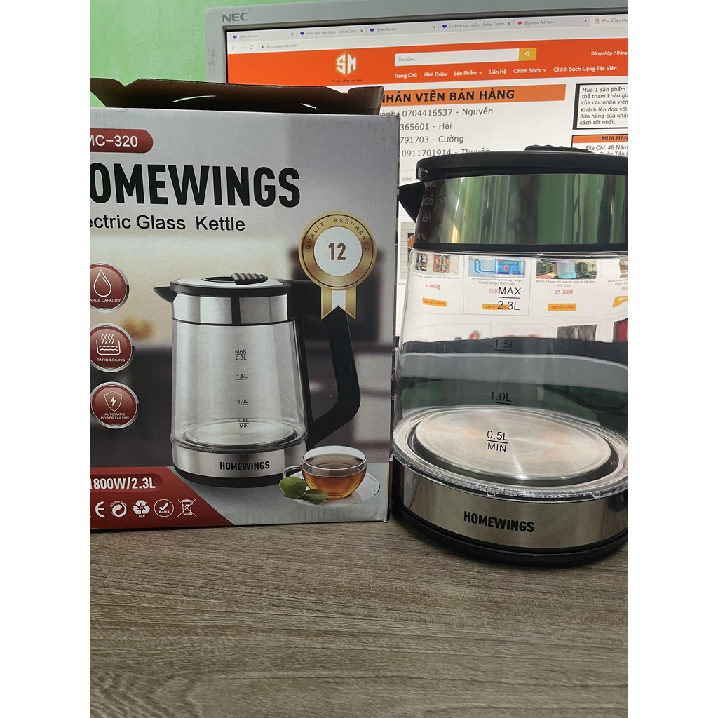 Bảo hành 12 Tháng-Ấm Đun THỦY TINH Homewing 2.3 Lít Công Suất 1800w