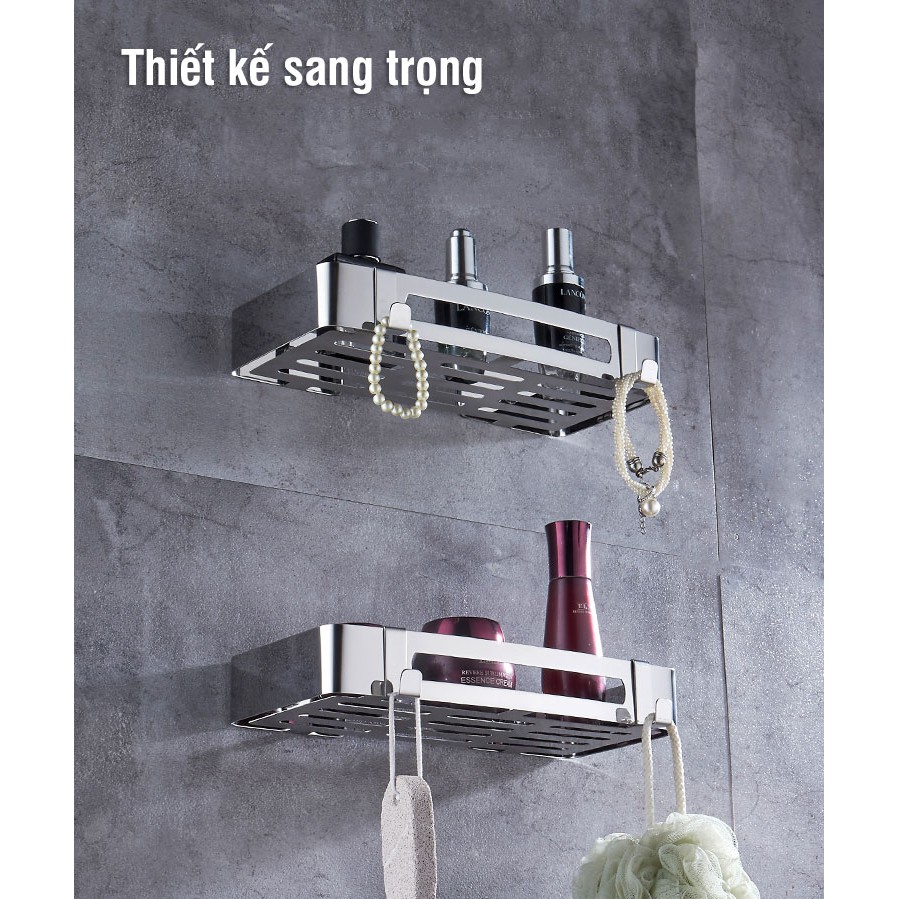 Kệ inox cao cấp để trong nhà phòng tắm có giá hình chữ nhật chống han gỉ, dán siêu chắc VKIT, kèm móc treo NT14