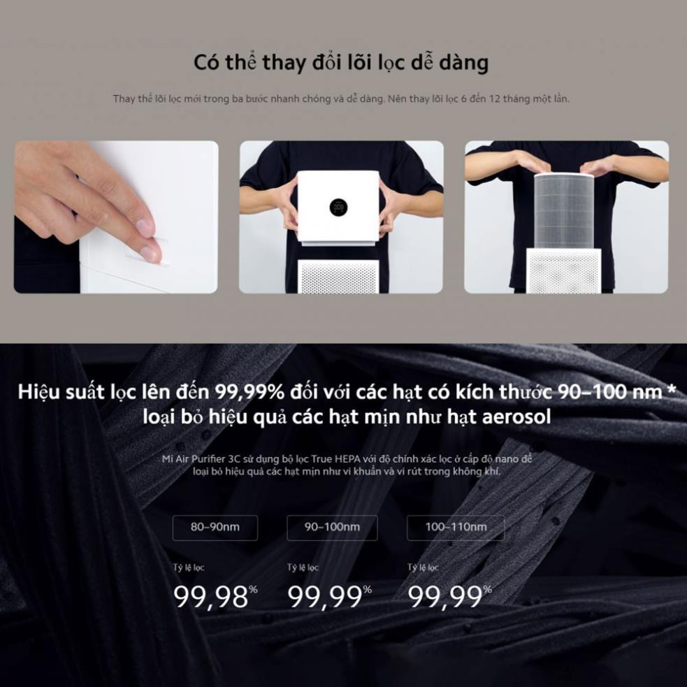 Máy lọc không khí Xiaomi Air Purifier 3C tích hợp ba cấp độ lọc: lớp lọc thô, lớp lọc than hoạt tính và lớp HEPA. Nhờ đó mà thiết bị có thể lọc sạch đến 99.97% các hạt bụi lơ lửng trong không khí, các hạt PM 2.5. Theo nhà sản xuất, máy lọc này có khả năng làm sạch tối ưu nhất trong không gian khoảng 28-48 m2. Và tốc độ làm sạch không khí (CARD) lên tới 380m3/h.