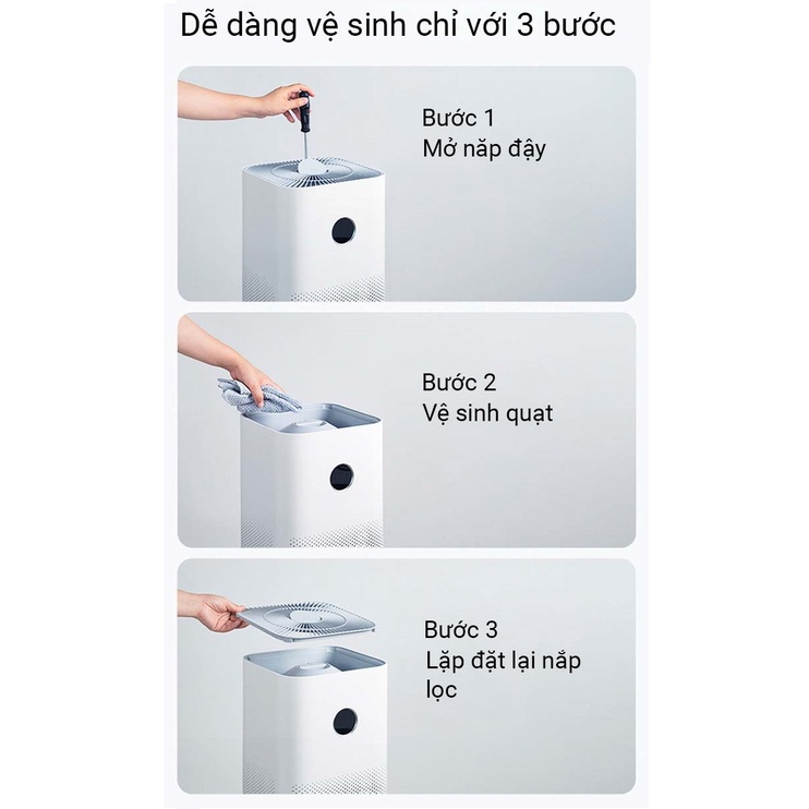 Chỉ bằng các thao tác đơn giản, bạn có thể dễ dàng vệ sinh máy lọc một cách nhanh chóng sau một thời gian sử dụng. Bạn chỉ cần dùng tua vít tháo nhẹ phần nắp bảo vệ phía trên và dùng khăn để lau phần cánh quạt một cách dễ dàng, sau đó bạn chỉ cần lắp đặt lại nắp bảo vệ máy lọc là có thể hoàn thành công việc vệ sinh máy.