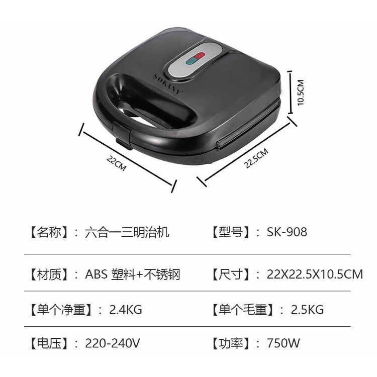 ZALO/HOTLINE 0369482060- Máy nướng bánh 6 in 1 sokany dùng để nướng các loại bánh có dạng lát mỏng (sandwich) hoặc các loại bánh tự làm. Máy có 6 chức năng: Nướng bánh Sanwich, Bánh mỳ kẹp, Vỉ nướng đa năng để nướng thức ăn (nướng thịt, nướng củ quả…). Máy nướng bánh còn có thể nướng bánh với các loại nhân hấp dẫn: Bạn có thể kẹp sandwich với bơ, pate, thịt, trứng, mứt quả... và bỏ vào máy. Sau 2 - 3 phút, phần vỏ bánh sẽ được nướng giòn, phần nhân bên trong vừa chín tới tạo vị thơm ngon, hấp dẫn tạo thành chiếc bánh Sandwich hấp dẫn, thơm ngon.