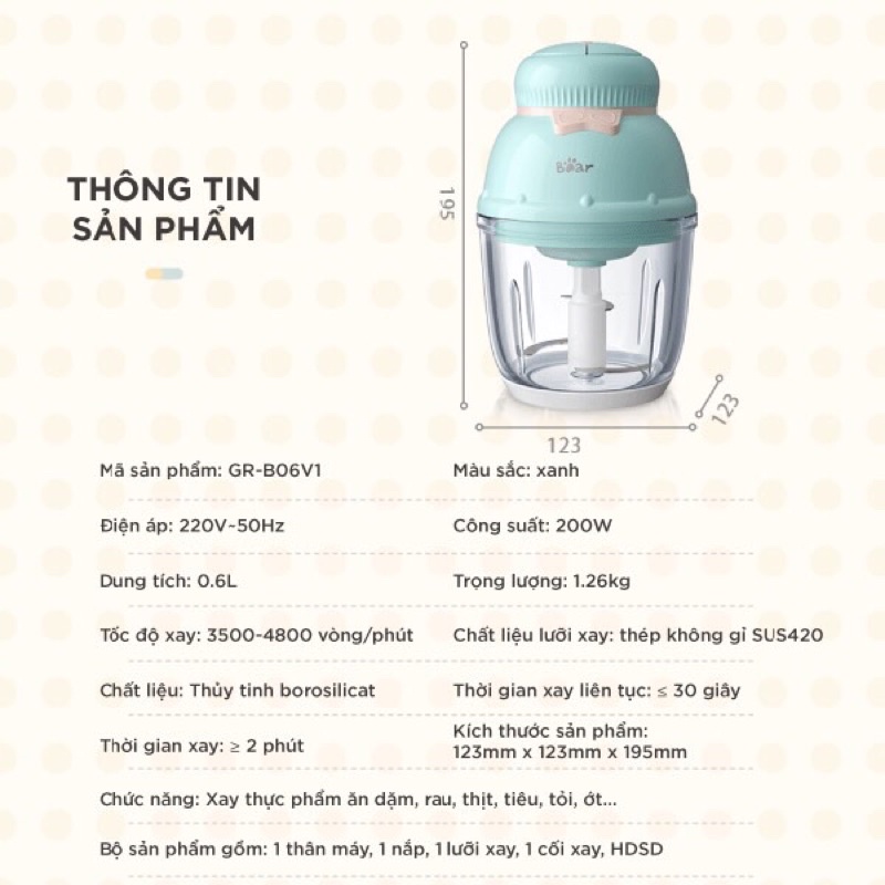 - Với công suất máy 120W kết hợp cùng lưỡi dao chữ S đa tầng sắc bén, máy xay cho bé ăn dặm Bear có thể xay nhuyễn các loại thực phẩm mềm sau khi sơ chế như: cà rốt, khoai tây, bánh quy, hành tây, rau xanh,... Để xay thịt, bạn nên cắt nhỏ thịt thành từng miếng, sau đó cho vào máy xay một lượng vừa đủ để không vượt quá giới hạn của cốc xay.