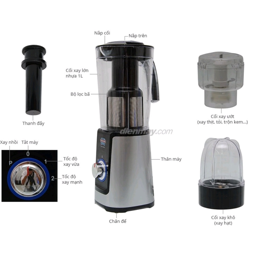 Cối lớn (1L) kèm tay cầm tiện lợi, có lưới lọc tiện dụng mang đến ly sinh tố hoa quả sánh mịn.