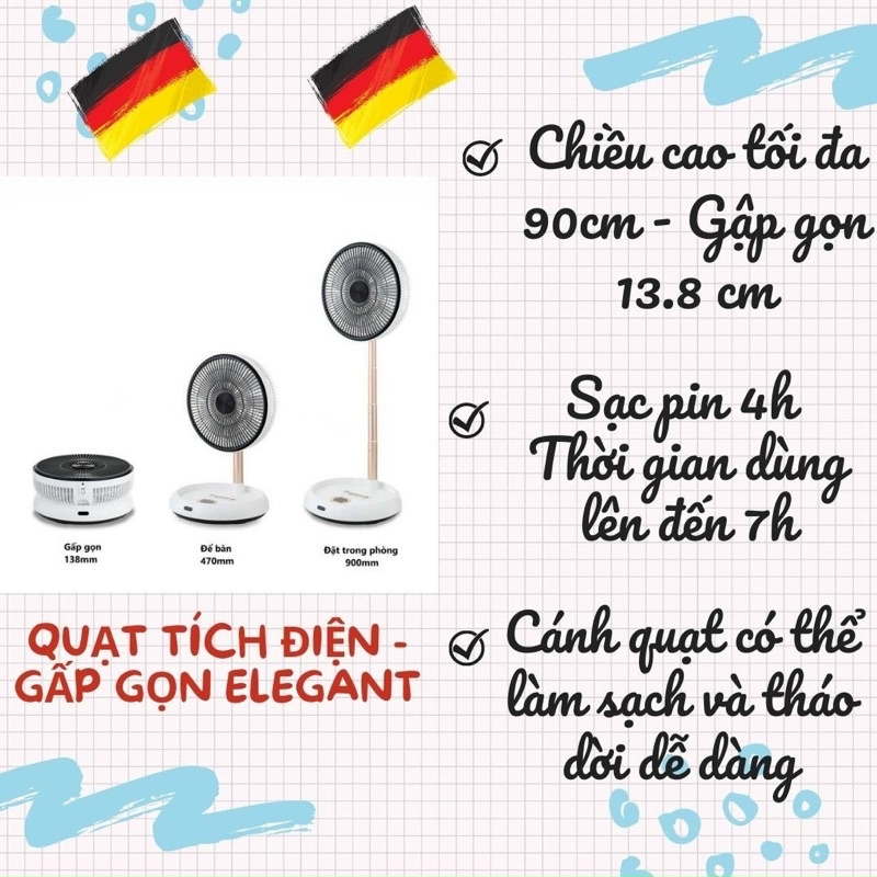 (Bảo hành 12 tháng) Quạt gấp gọn, tích điện thông minh ELEGANT - Đức