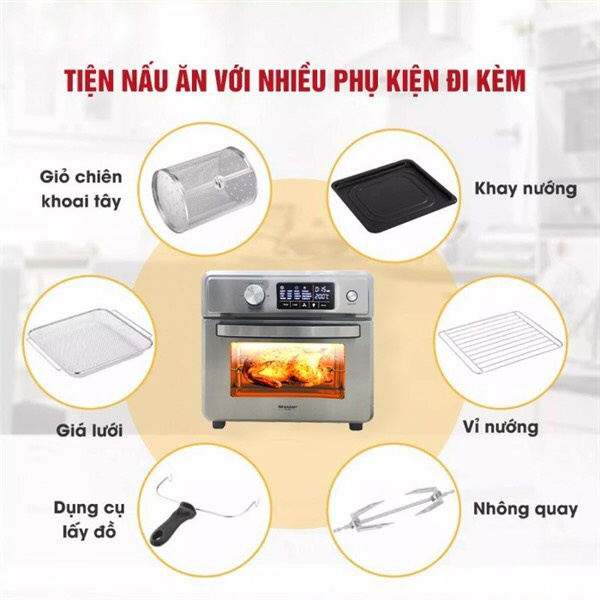 Phụ kiện đa dạng giỏ/lồng chiên, xiên quay, nhông quay, vỉ nướng chống dính, khay hứng dầu, dụng cụ lấy đồ và tấm lưới chắn dầu.
