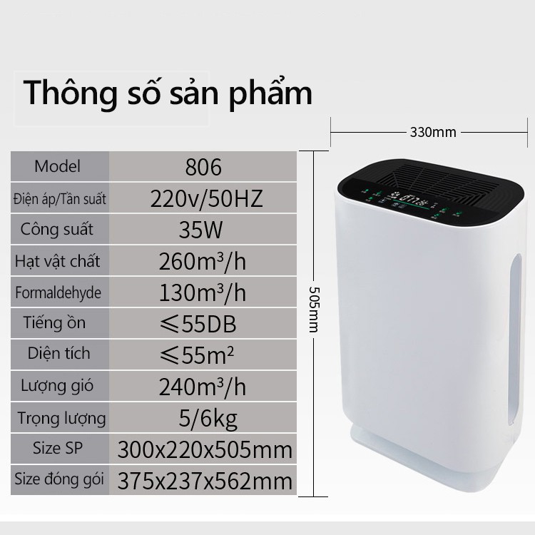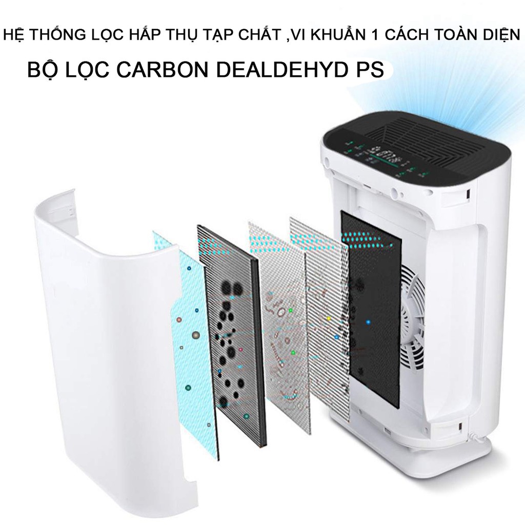 - Chức năng chính: lọc không khí, tạo ion âm, loại bỏ khói bụi, phân hủy Formaldehyde và Benzen, khử trùng không khí
