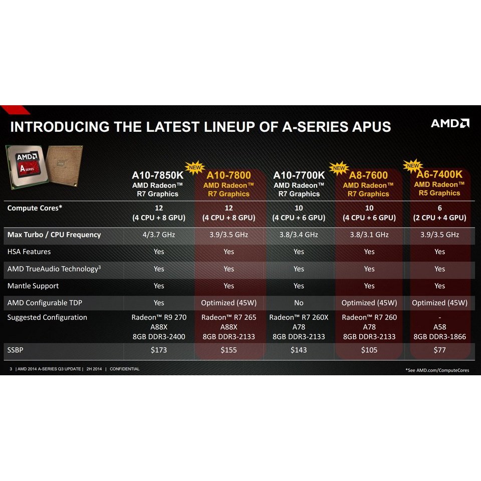 A6-7400K (giá khoảng 1,35 triệu đồng) thuộc phân khúc phổ thông của dòng APU Kaveri dành cho máy tính để bàn và có xung nhịp cao tương đương mẫu chip cao cấp A10-7800. Cụ thể xung nhịp mặc định của chip là 3,5 GHz và có thể tăng tốc đạt 3,9 GHz. Điểm khác biệt là mức tiêu thụ năng lượng (TDP) của A8-7670K chỉ 65W và thậm chí có thể hạ xuống mức 45W, tuy nhiên sẽ ảnh hưởng đến hiệu năng chip.