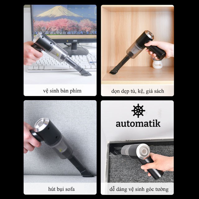 – Chức năng: hút bụi nhanh, sạch, hợp vệ sinh, công nghệ tân tiến cho ô tô, bàn phím, tủ, ghế sô fa…