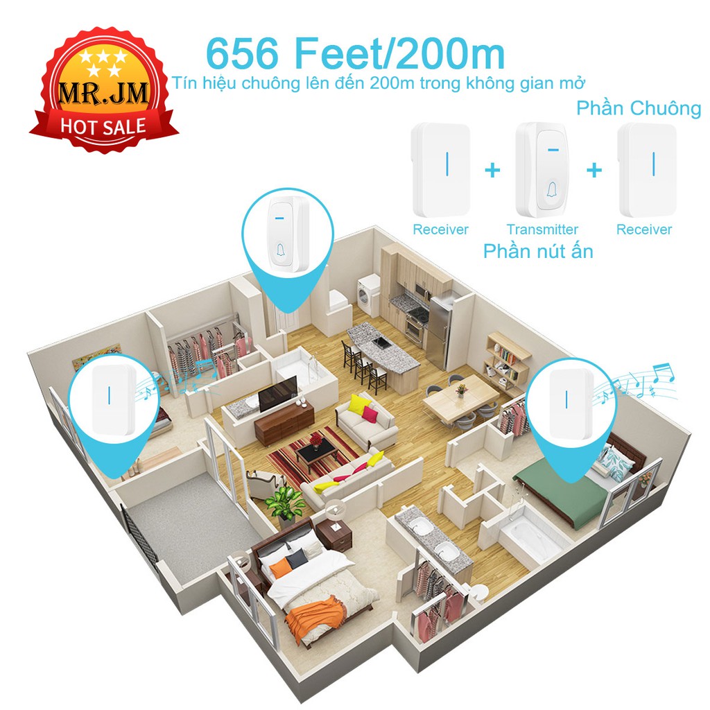 _ Khoảng cách phát sóng xa, từ nút nhấn đến chuông là 20-200m ( xuyên tường - ngoài trời)