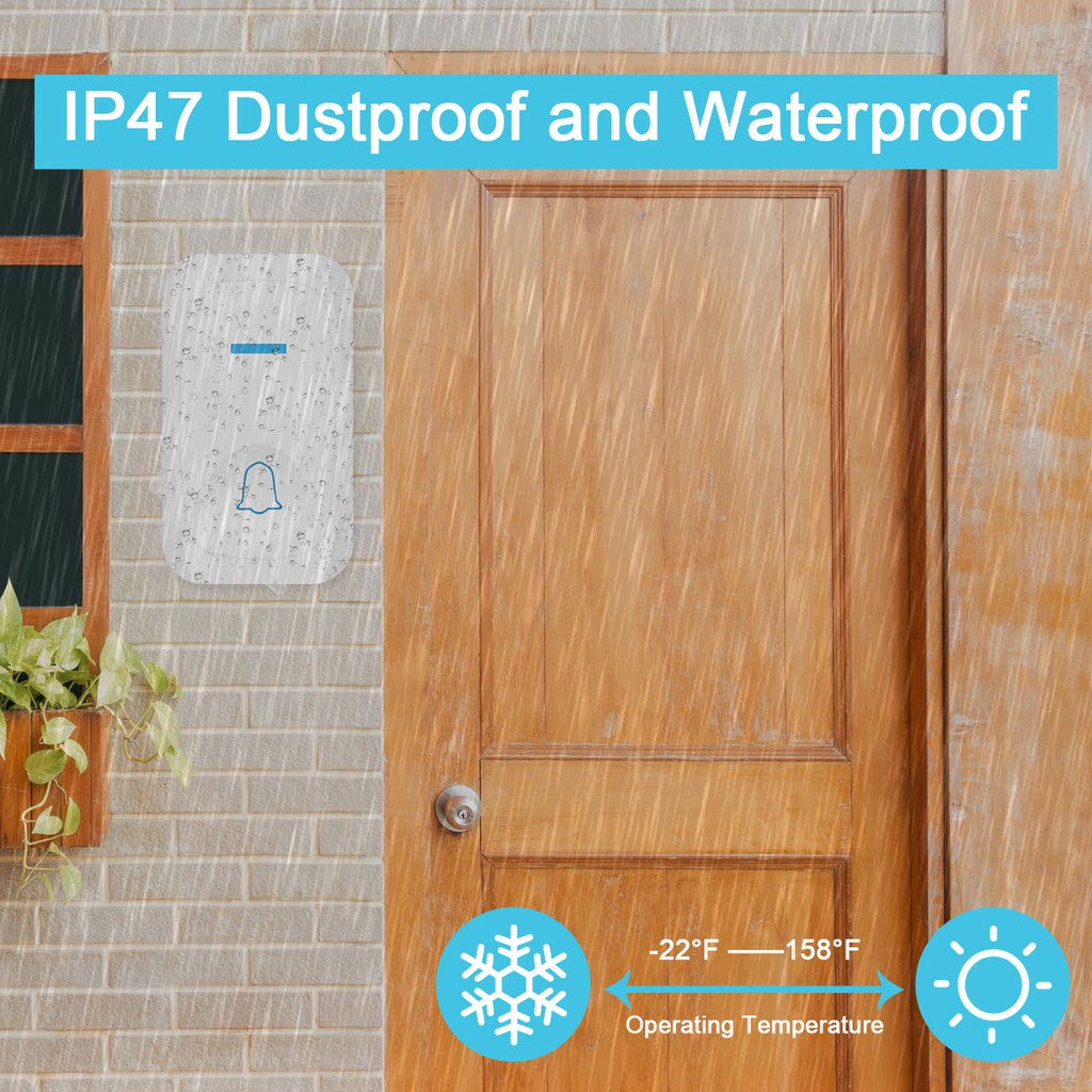 - Chuông cửa không dây với Phần nút nhấn được thiết kế CHỐNG NƯỚC không ngại khi dùng lộ thiên