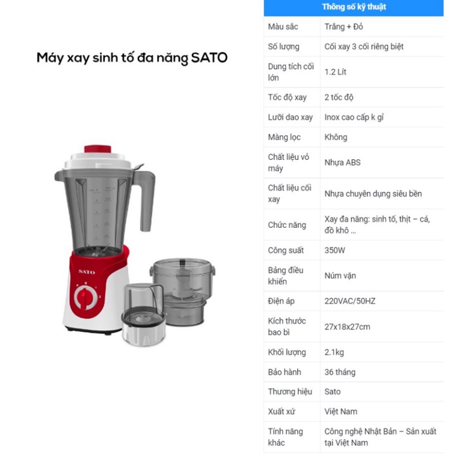 Máy xay sinh tố SATO 1.2L có 3 cối máy xay đa năng xay rau củ quả xay thịt tỏi ớt xay thức ăn dặm cho bé máy làm sữa hạt