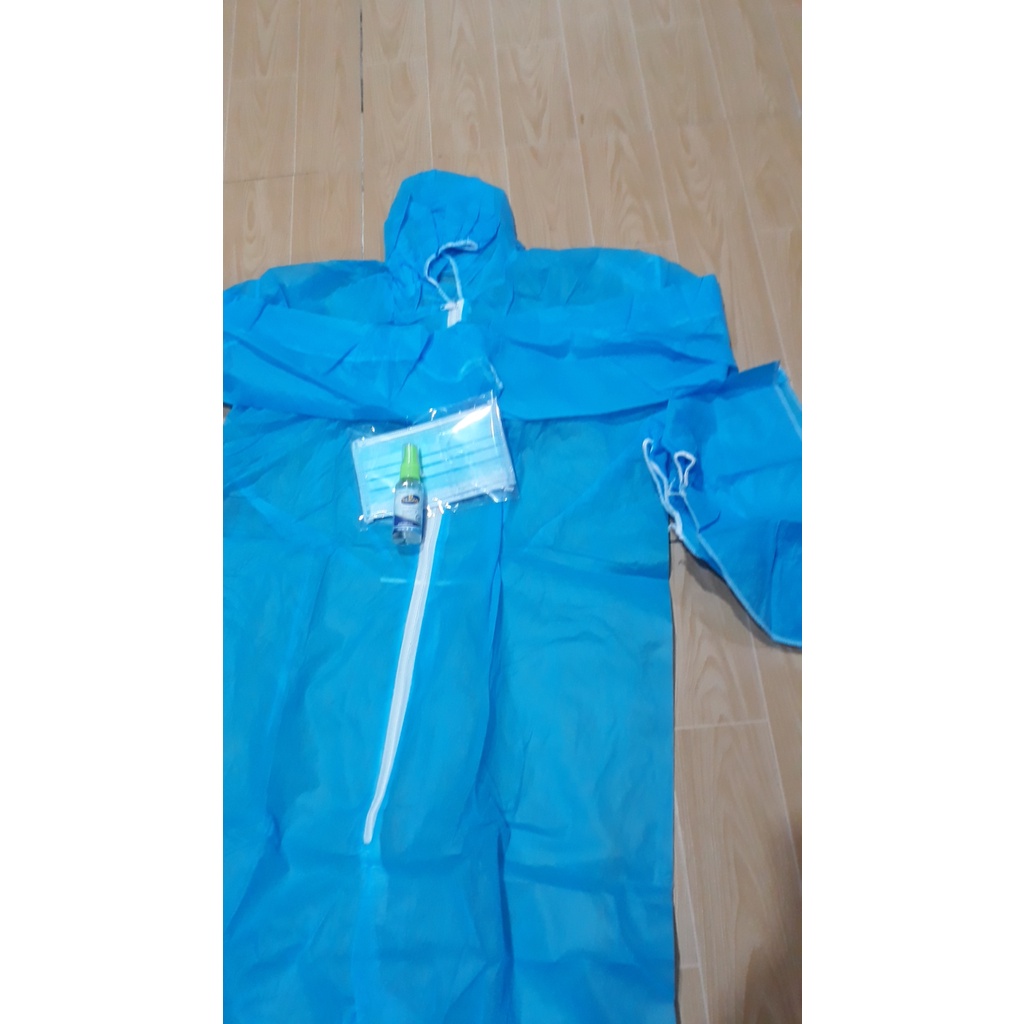 - Combo 4 món: đồ bảo hộ + bọc giày + set 3 khẩu trang y tế + chai xịt khuẩn tay 50ml