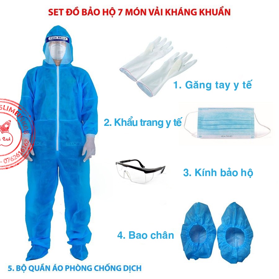 - Bộ 7 món đầy đủ bao gồm: áo quần mũ, khẩu trang, bao giày trùm, găng tay cao su và kính bảo hộ