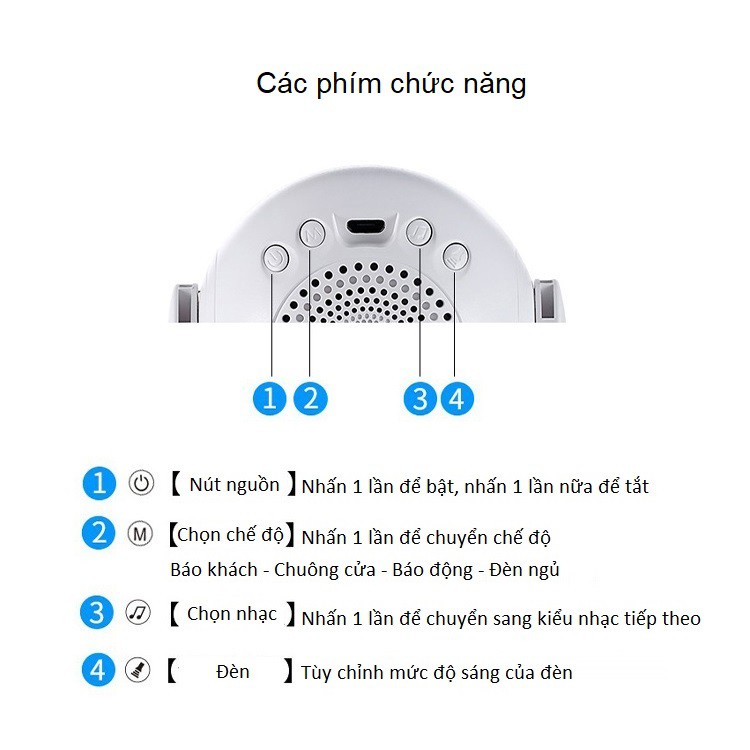 ✔️ Với chế độ báo khách: bạn nhấn phím có hình nốt nhạc để thay đổi nhạc chào khách. Với chế độ này, thiết bị được cài sẵn 5 ngôn ngữ khác nhau: tiếng anh, tiếng trung, tiếng nhật, tiếng hàn, tiếng thái và tiếng "ding dong". Bên cạnh đó, bạn cũng có thể nhấn nút đèn để làm thay mức cường độ âm của thiết bị.