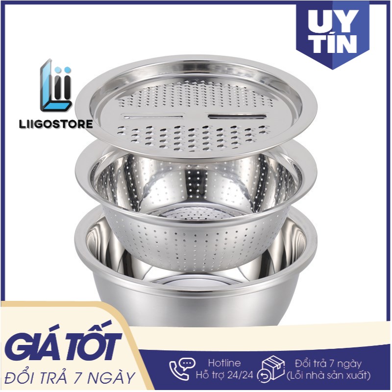 Bộ bao gồm : 01 Mặt nạo nhiều kiểu, 01 Rổ inox, 01 Chậu inox 100% cao cấp dày dặn